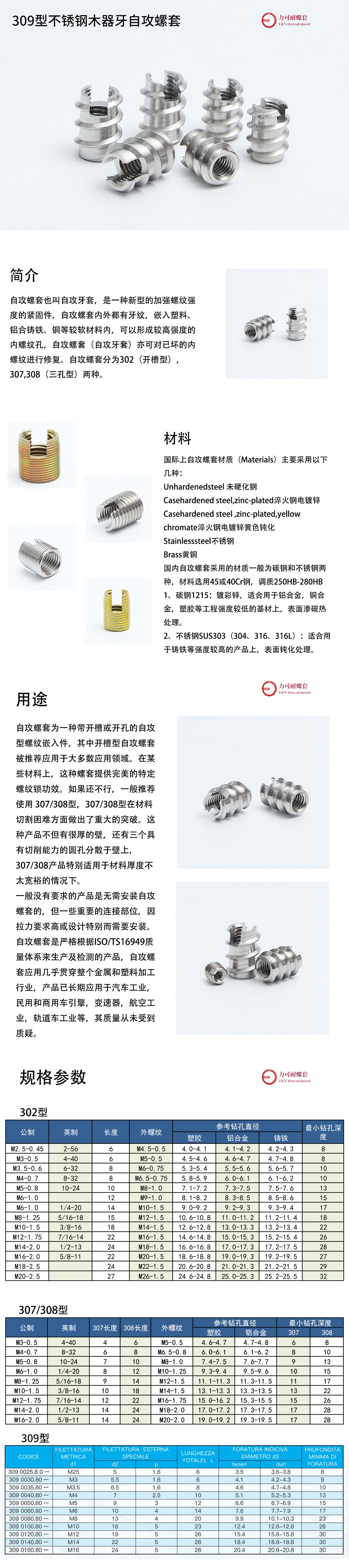 品名:309型不锈钢木器牙自攻螺套
