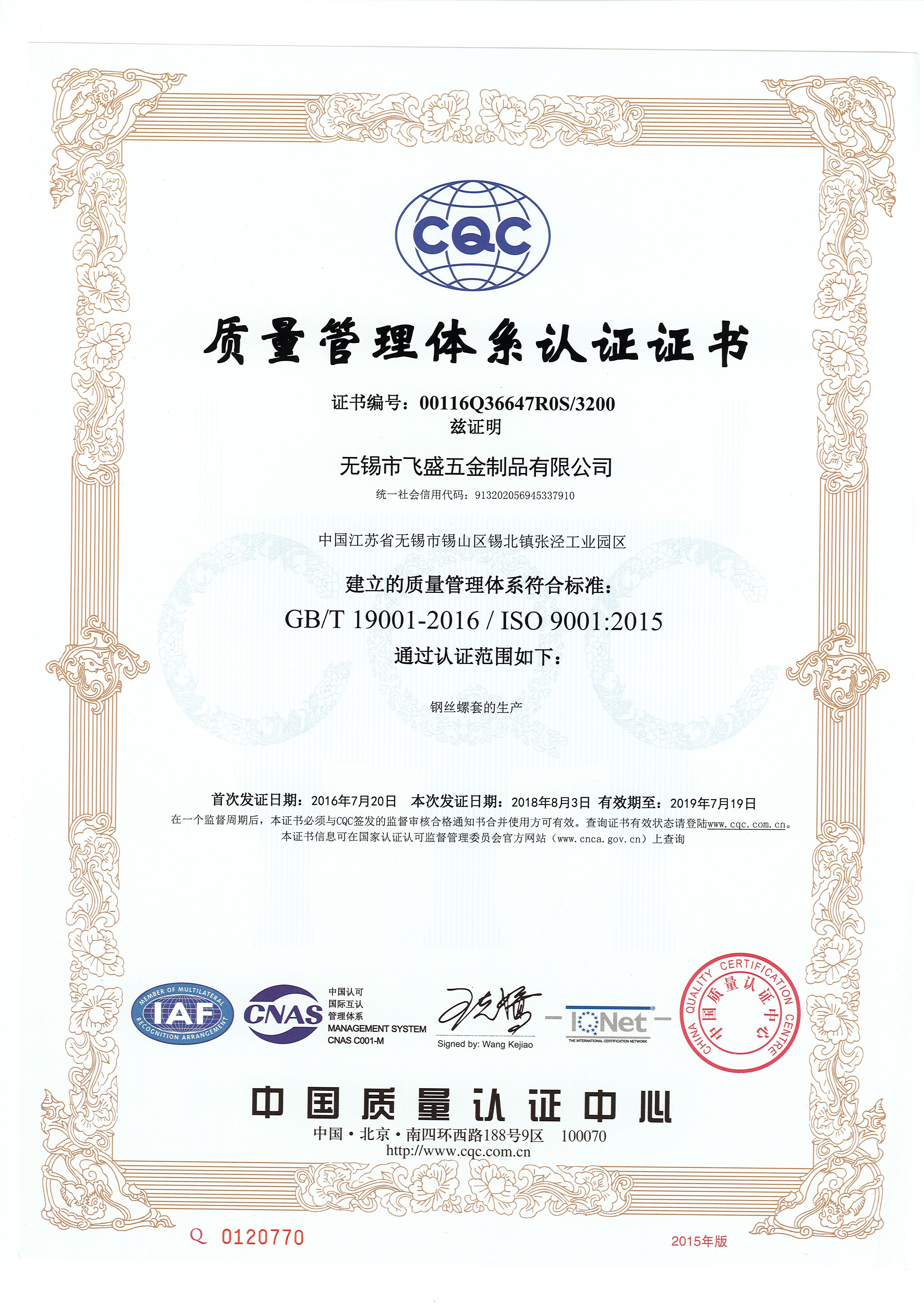 GB/T 19001-2016/ ISO 9001:2015质量管理证书